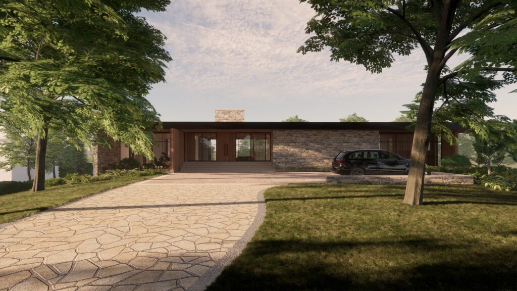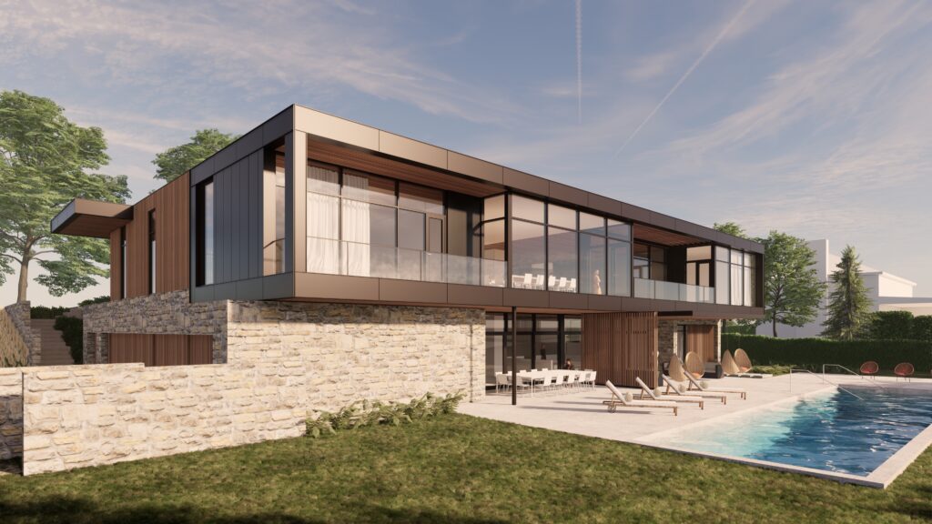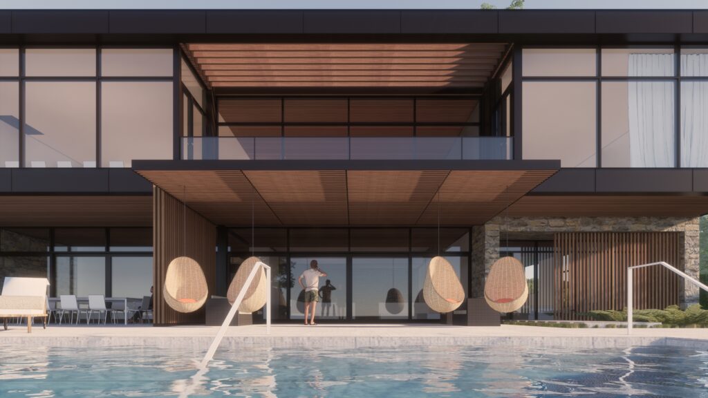 This impressive residence with refined lines and noble materials takes full advantage of the site’s exceptional width and its proximity to the water. Floor to ceiling windows bring the outdoors in, creating a strong connection with the surrounding natural environment by inviting light and unobstructed sightlines through each facades. These elements are inspired by mid-century architectural trends and allude to a clear elegance the clients wished to see in their new house.