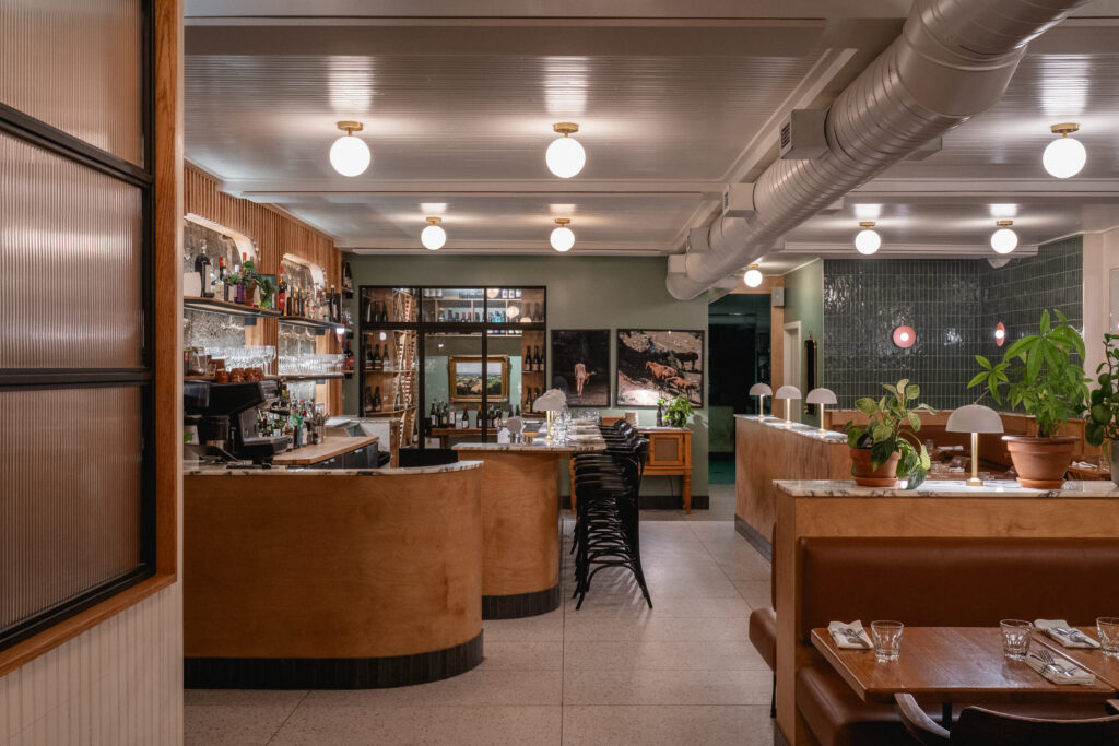 Reusing the original muted palette of pale greens, medium-toned woodgrain, and supple, tanned leather, the design concentrates itself around the new hearth-like bar as well as the addition of a glass-enclosed wine and charcuterie garde-manger. With the addition of deep blue bar tile, gently-curved tray ceilings, red-toned marble table tops, and modern café chairs, each element elevates the customer experience without sacrificing the intimacy of the original space's familiarity.