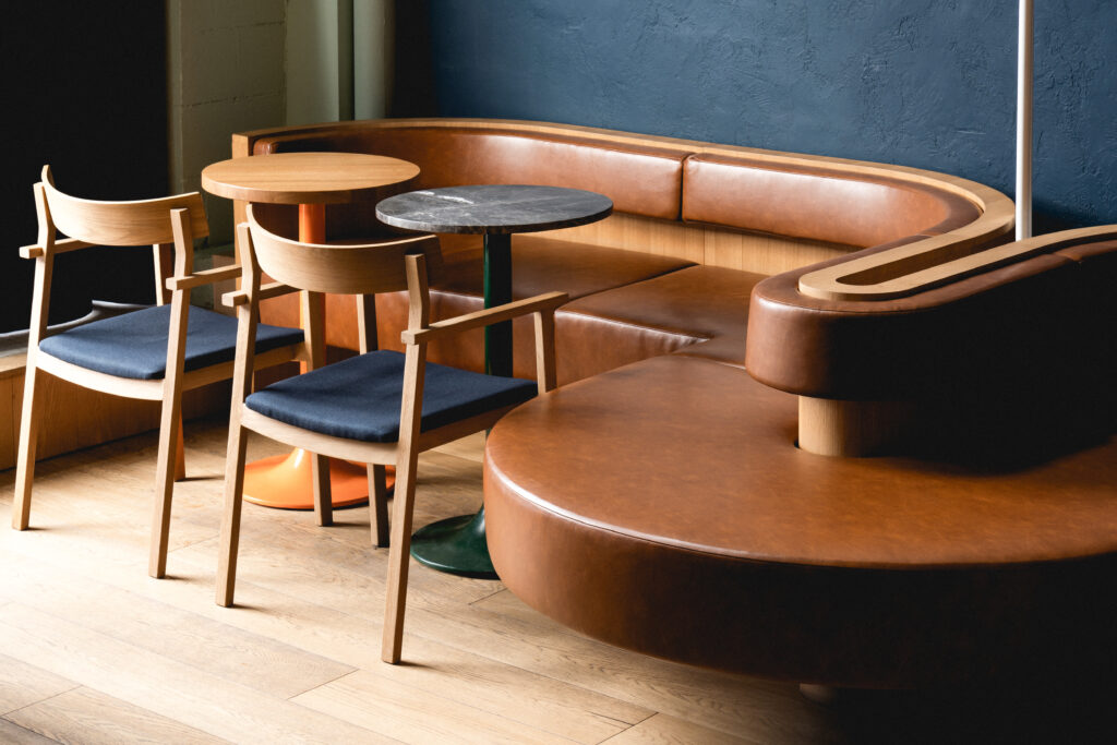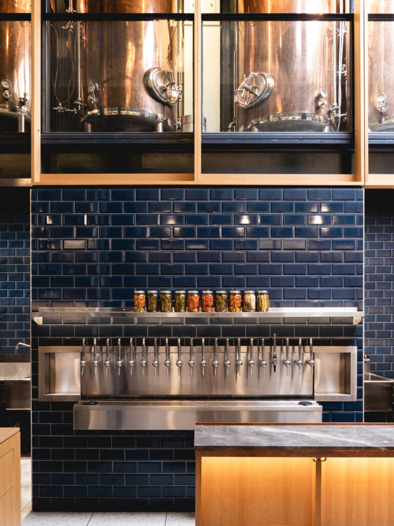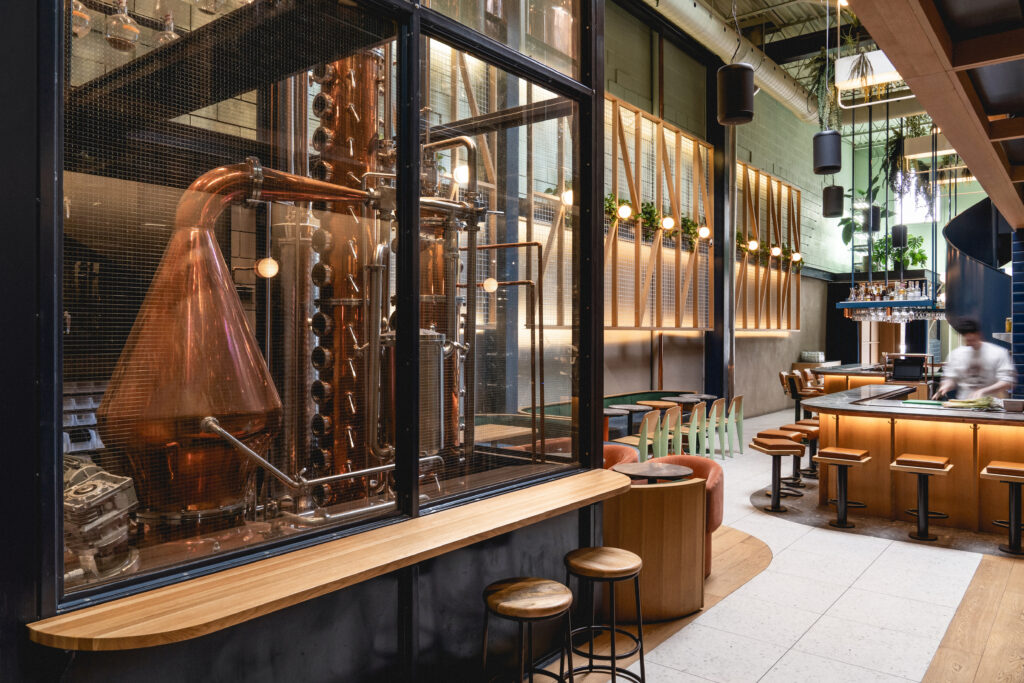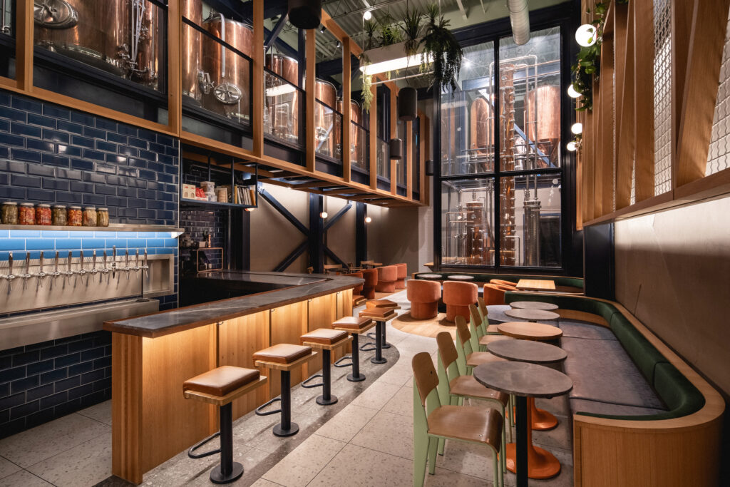 With an open floor plan, the inclusion of wood tones and vibrant colors of turquoise and green, the palette embodies the traditional warming effects of spirits with the vibrancy of natural botanicals.