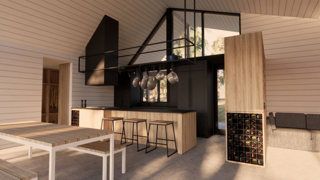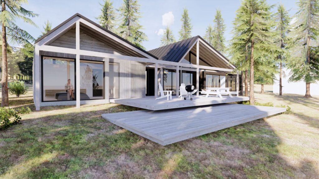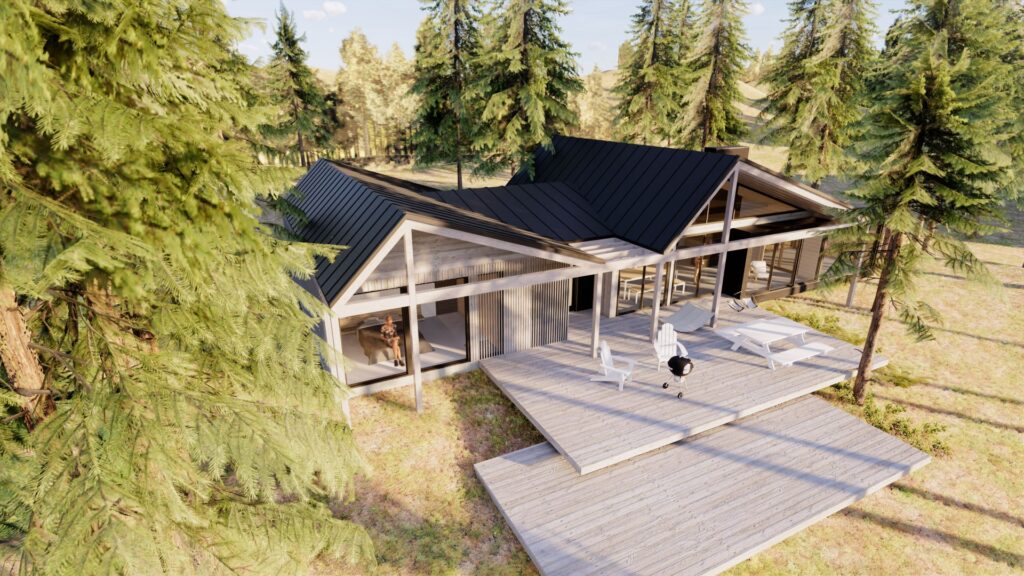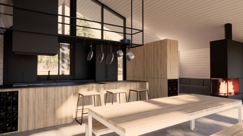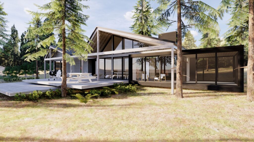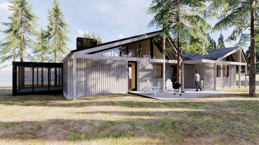Fusion entre le courant mid-century modern et l'archétype du chalet Québécois, ce projet aspire à un caractère intemporel et joue la carte d'une certaine nostalgie liée aux chalets de notre enfance.