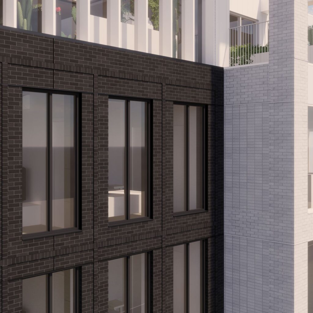Avec son espace commercial double hauteur à l'angle du rez-de-chaussée et avec sa placette végétalisée, le projet soigne l'interface avec l'espace public. Immédiatement au-dessus, un volume de deux étages en projection abrite les aires communes intérieures du projet, et agit comme une marquise protégeant l'entrée. La vie commune du projet Vertica se prolonge jusqu'au toit où sont aménagées une large terrasse partagée et une serre commune où pratiquer l'agriculture urbaine tout au long de l'année. Les étages supérieurs du bâtiment bénéficient de vues imprenables au Sud sur le fleuve et les collines Montérégiennes alors qu'à l'Ouest, le centre-ville, le Mont-Royal et le stade Olympique sont au premier plan.