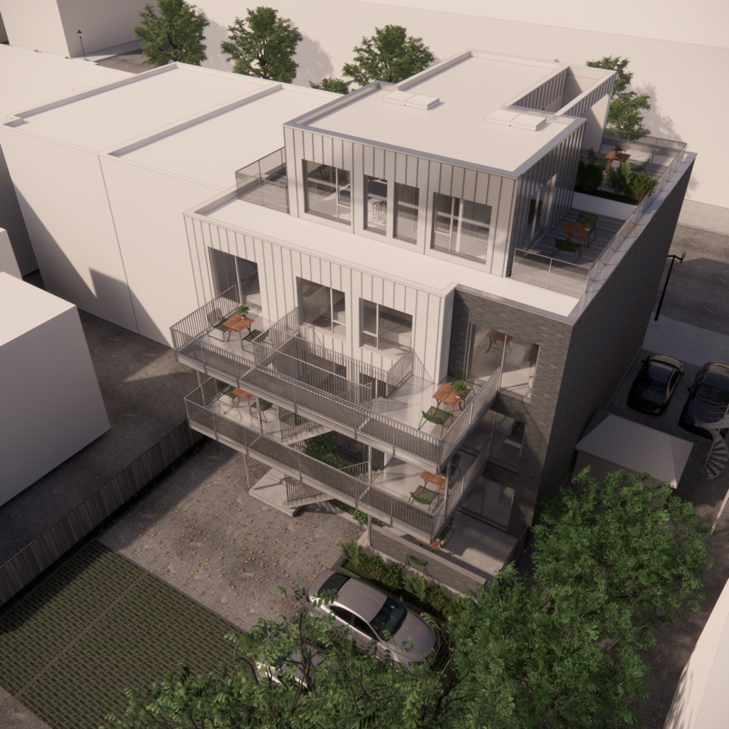 New construction project for a residential multiplex with 8 condominium units on Island Street in Montreal. It plans to establish itself on a vacant lot currently used for asphalt parking without vegetation.