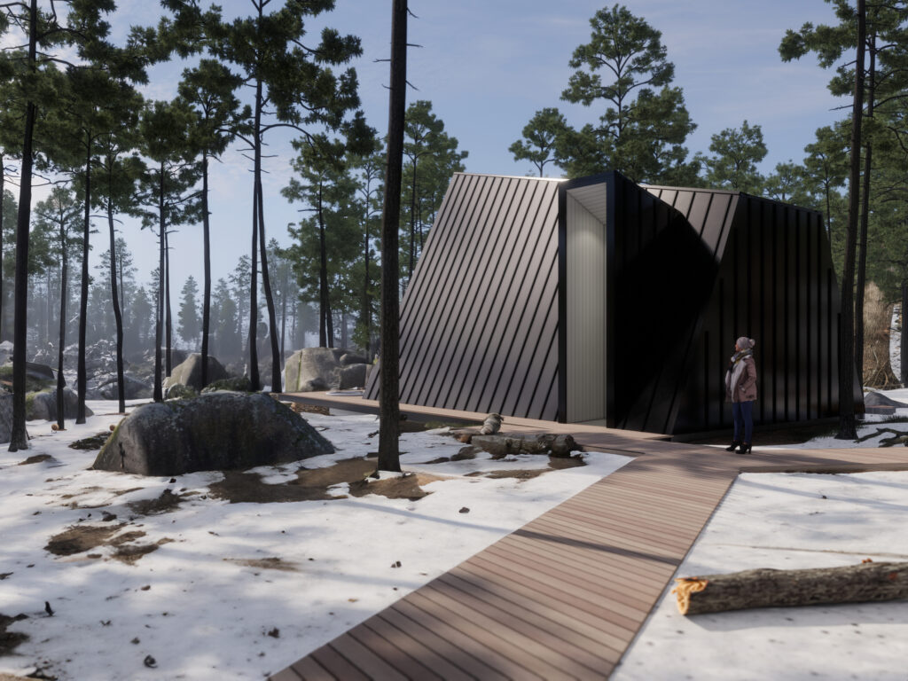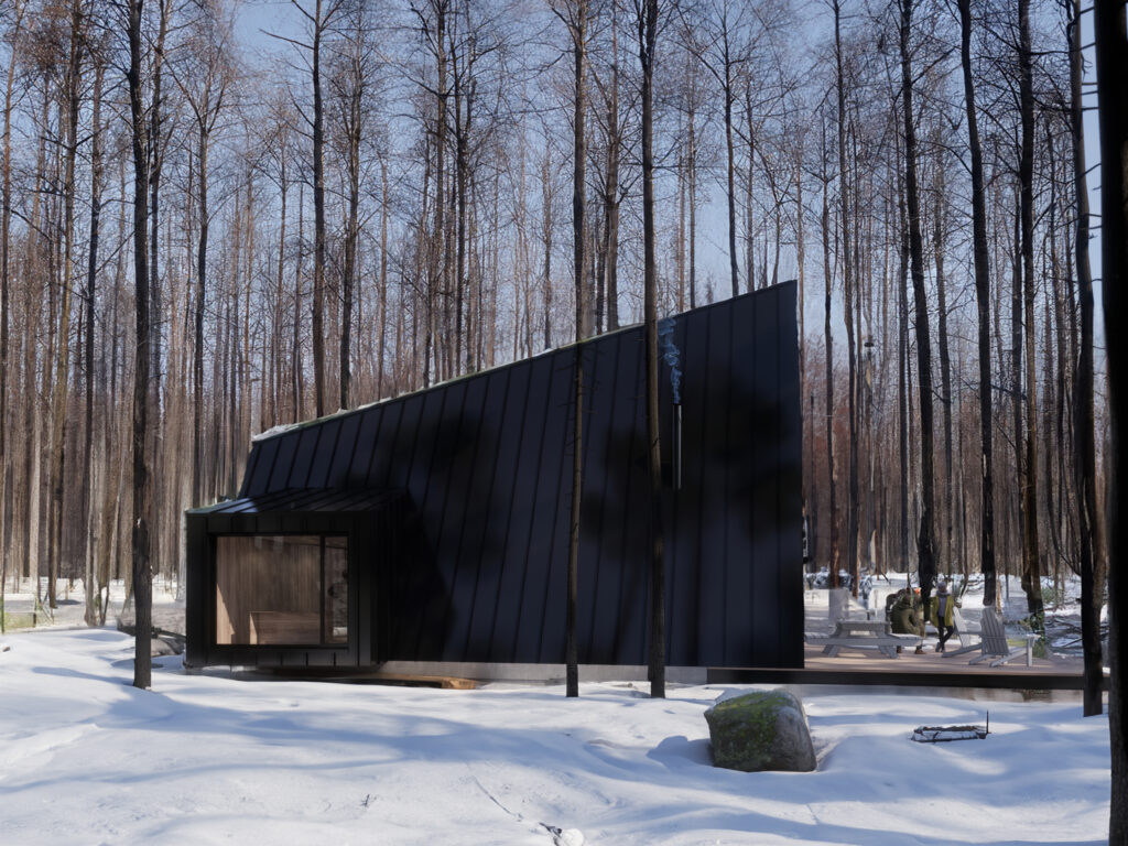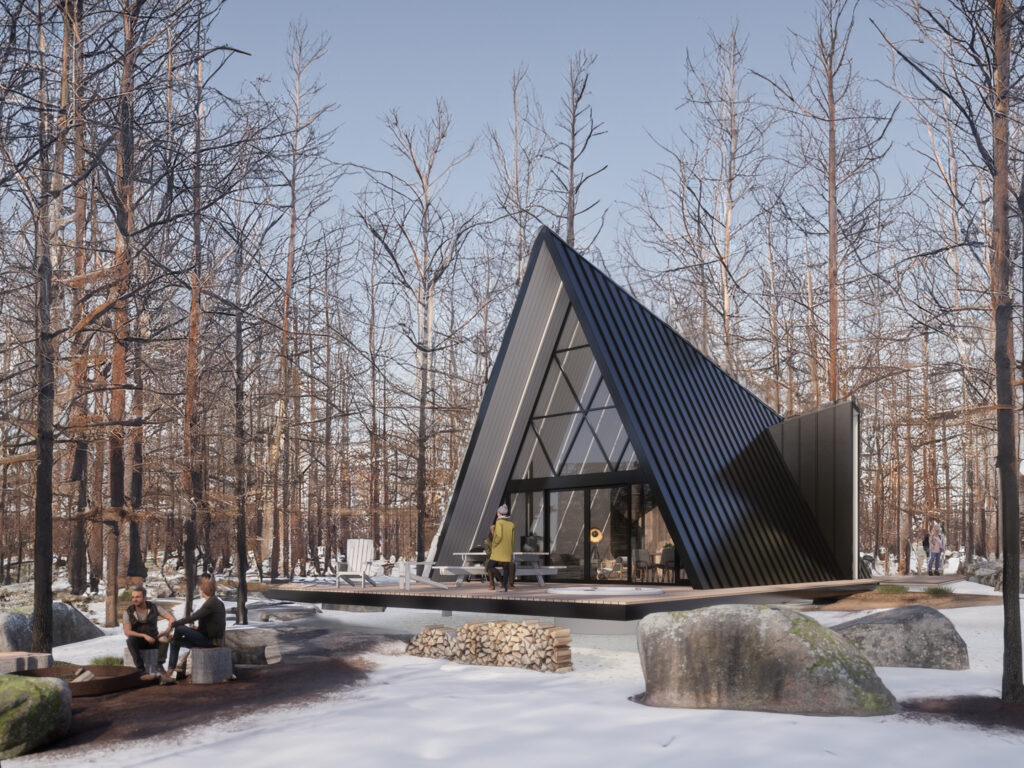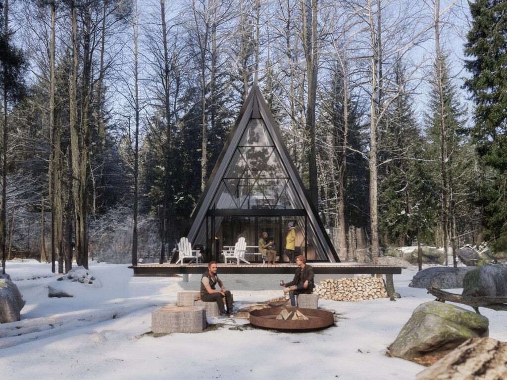 Projet de petits chalets en location courte. Les formes simples et épurées du système structural en forme A jouent sur les contrastes entre clair et obscure. Un ouverture vers le ciel dans l'espace nuit amène de la lumière naturelle tout en préservant l'intimité.