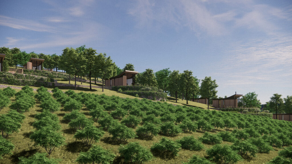 Set on a hill at the edge of a vineyard, the cabins are spread out on different levels, with stone walls recalling old wine-growing regions' aesthetics.