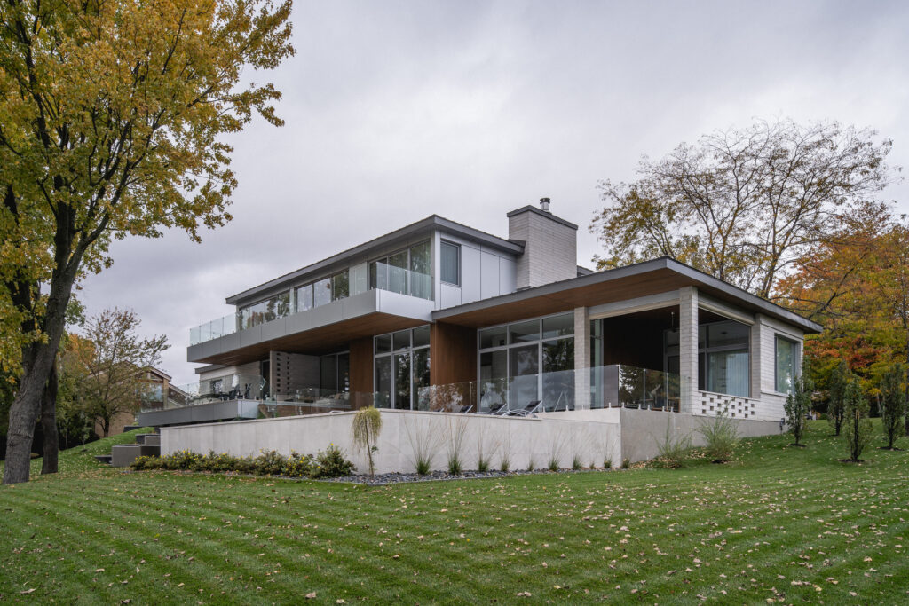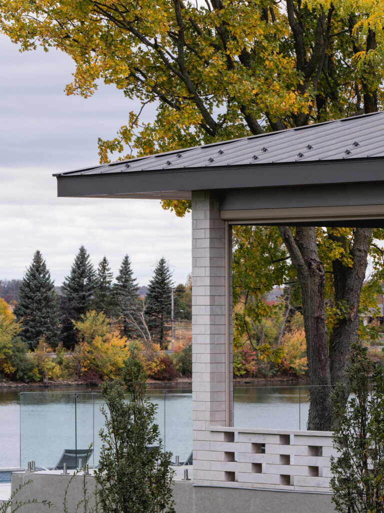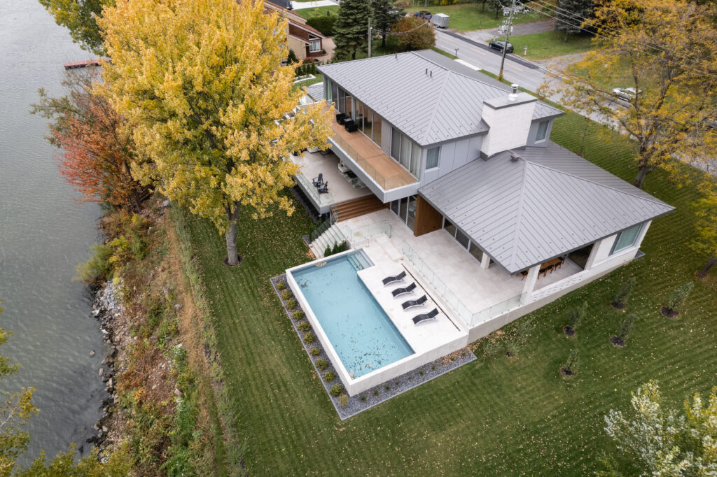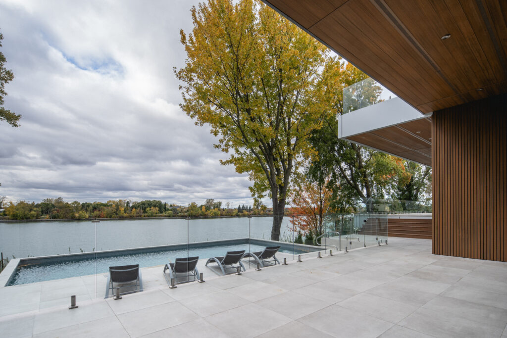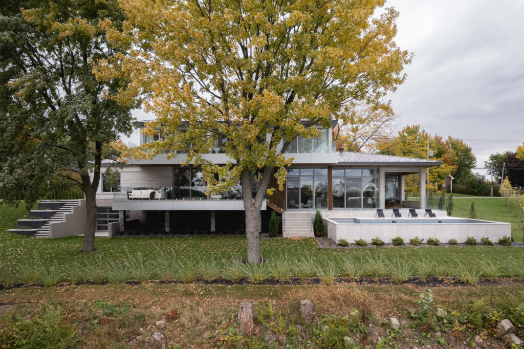 This residence, located on the edge of the Richelieu River, opens onto an outdoor living space and views of the water. The extension of the roof where the interior and exterior intersect creates a bridge space where various relaxation and reception areas are arranged. It is with respect for the existing environment that mature trees coexist with this new home to offer a feeling of a Californian oasis to the occupants.