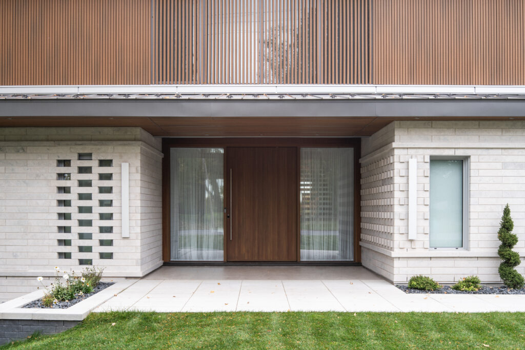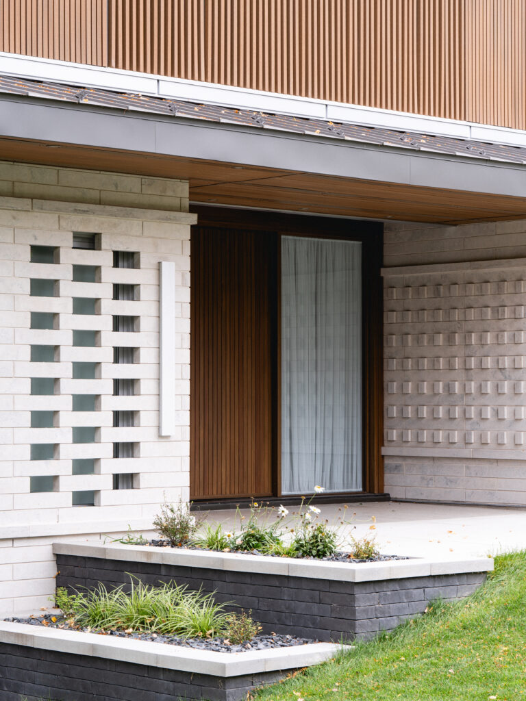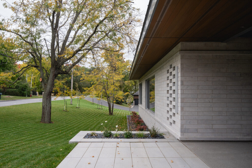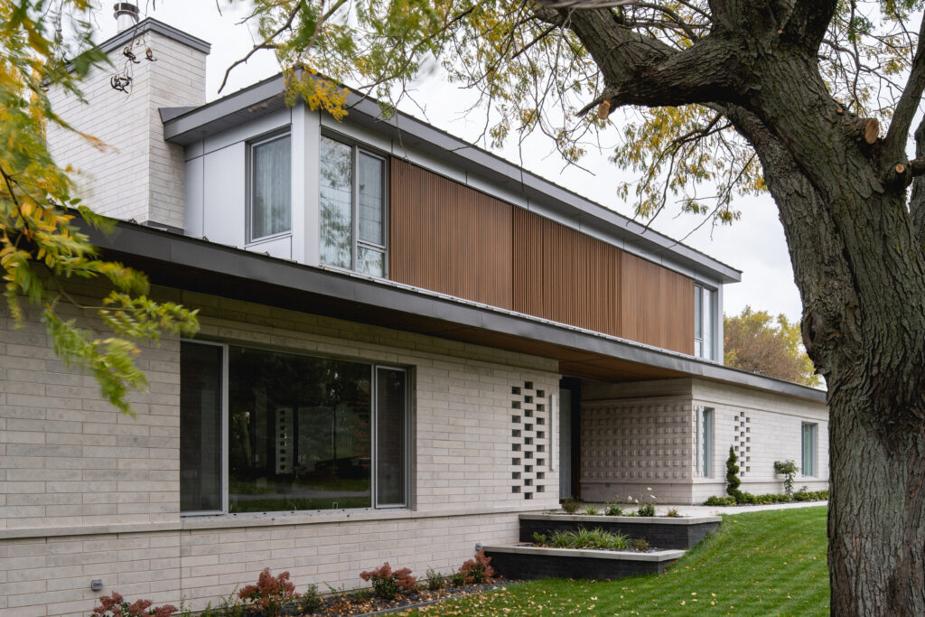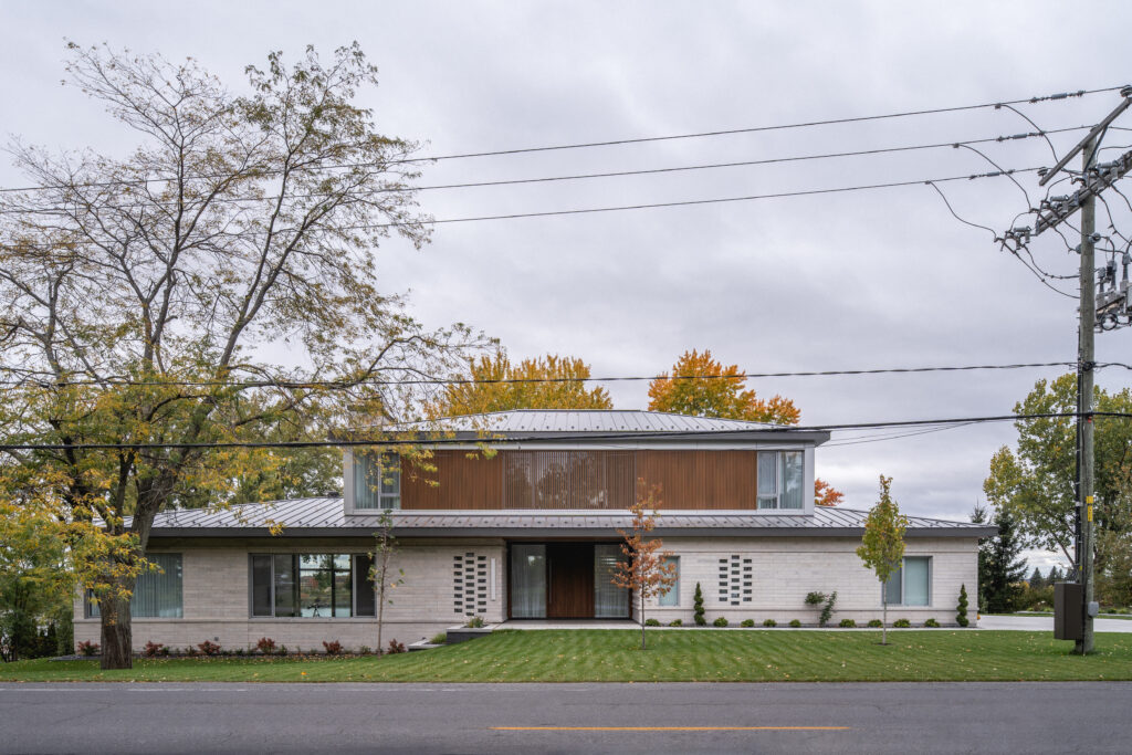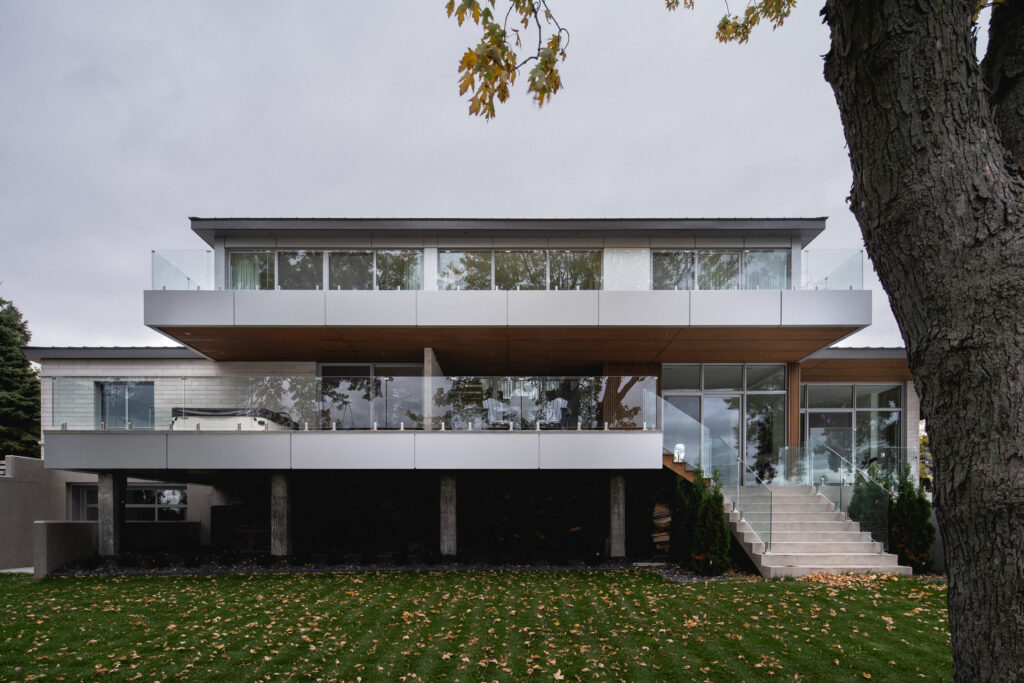 This residence, located on the edge of the Richelieu River, opens onto an outdoor living space and views of the water. The extension of the roof where the interior and exterior intersect creates a bridge space where various relaxation and reception areas are arranged. It is with respect for the existing environment that mature trees coexist with this new home to offer a feeling of a Californian oasis to the occupants.