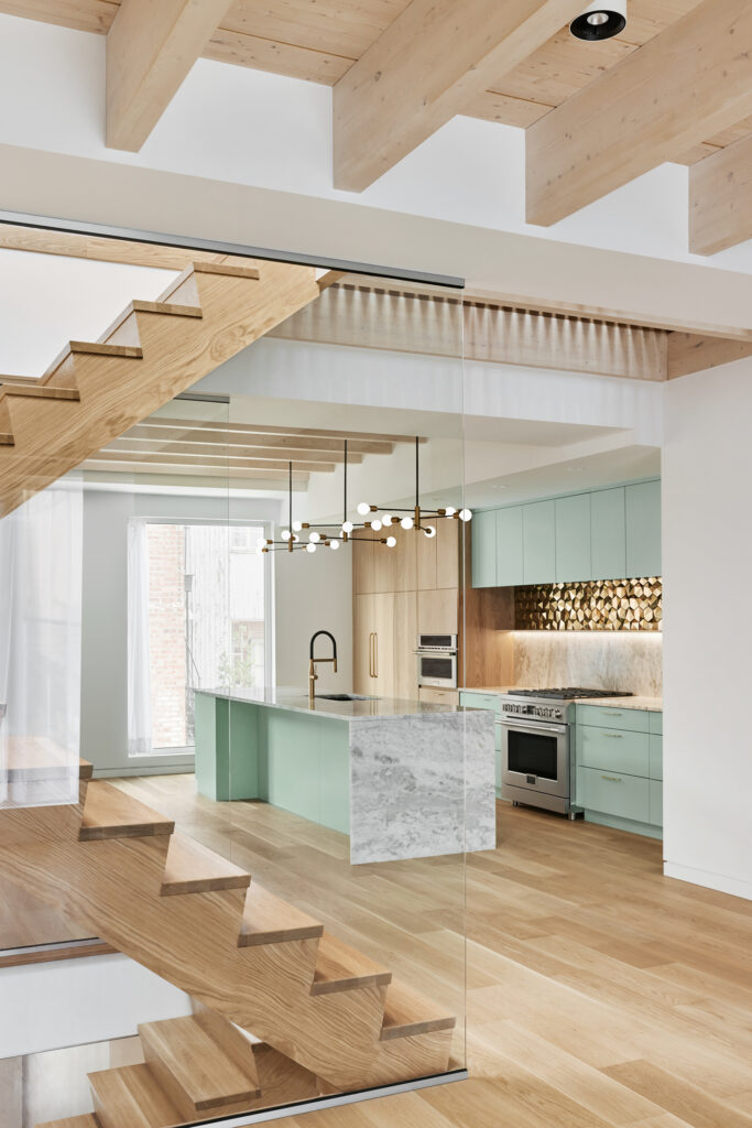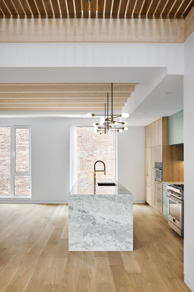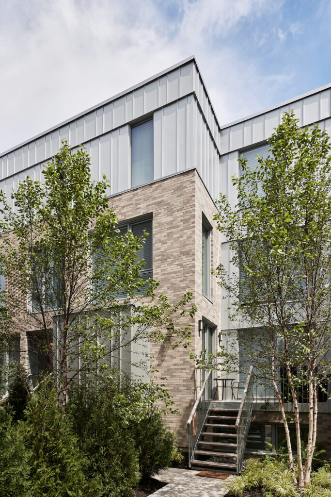 Les deux maisons de ville se développent en palier multiples et profitent de la tranquillité de la ruelle verte qui les bordent. En plus d'une terrasse privative au toit, les deux nouvelles unités partagent la cour intérieure formée entre l'immeuble existant et la nouvelle construction.